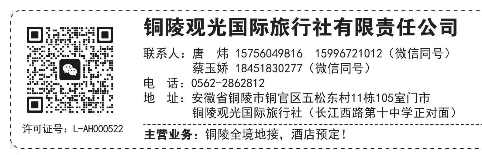 Copyright 安徽銅陵市觀光旅行社有限責(zé)任公司 地址: 安徽省銅陵市長(zhǎng)江西路第十中學(xué)正對(duì)面銅陵觀光國(guó)際旅行社(五松東村11棟105)